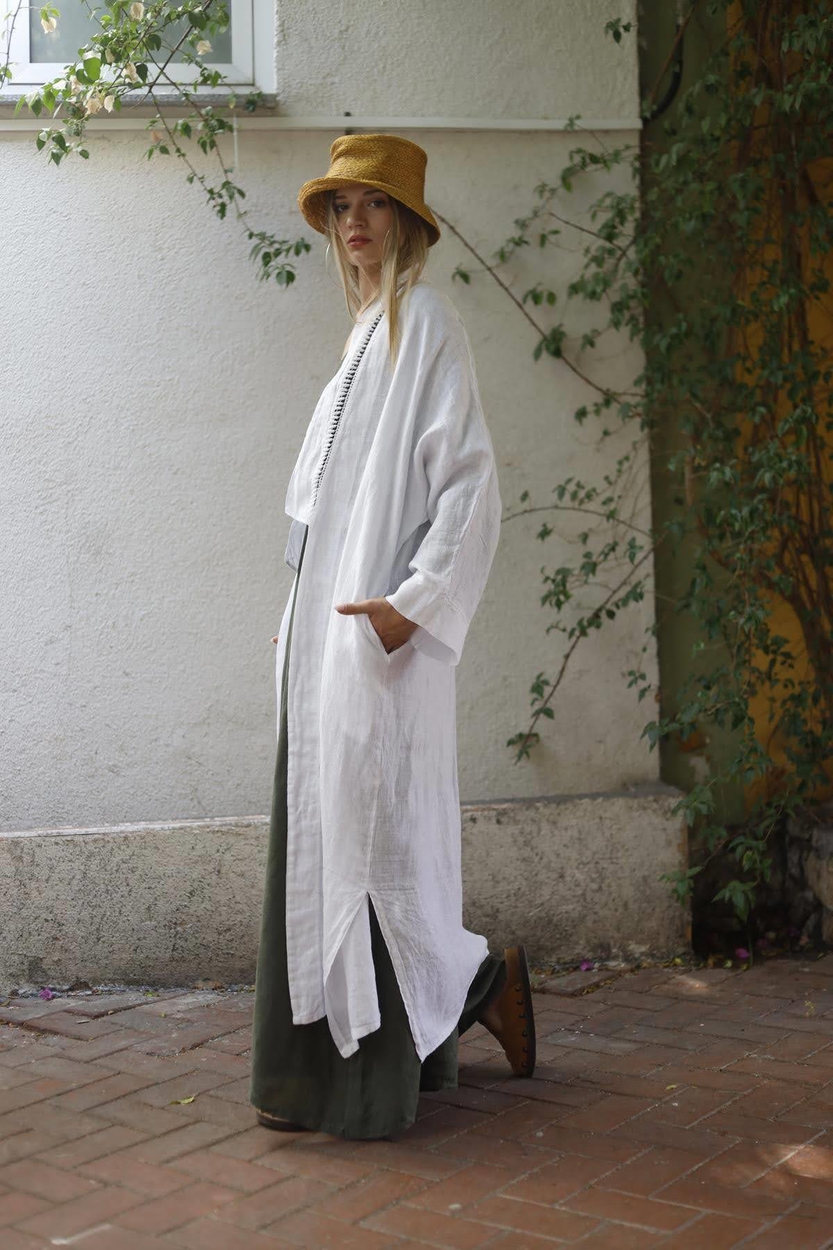 White Collar Detailed Linen Caftan (KKFN-FAL-016-KTN-BE-STD)