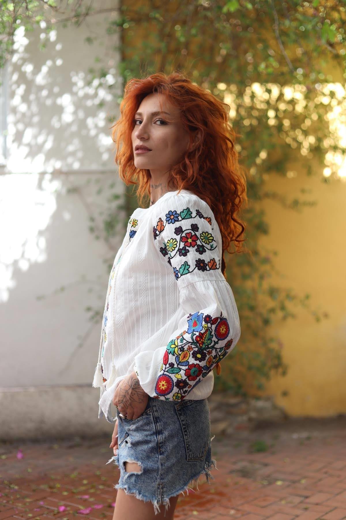 White Embroidered Balloon Sleeve Shirt (KG-ESQ-024-PA-BE-S)