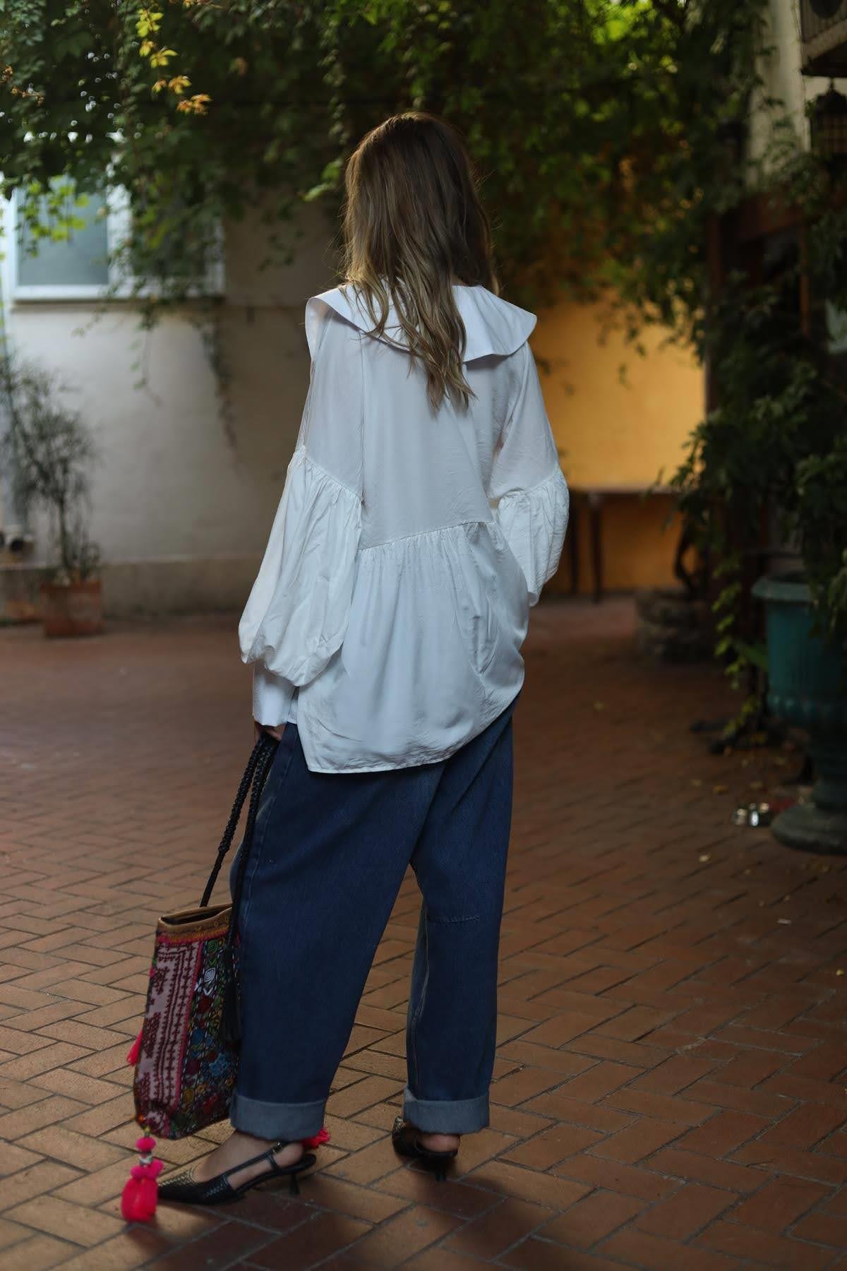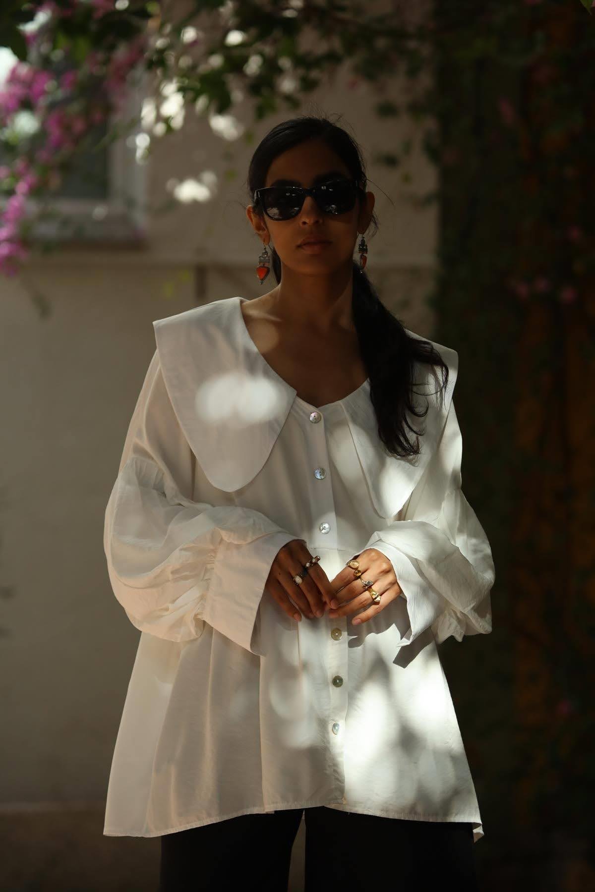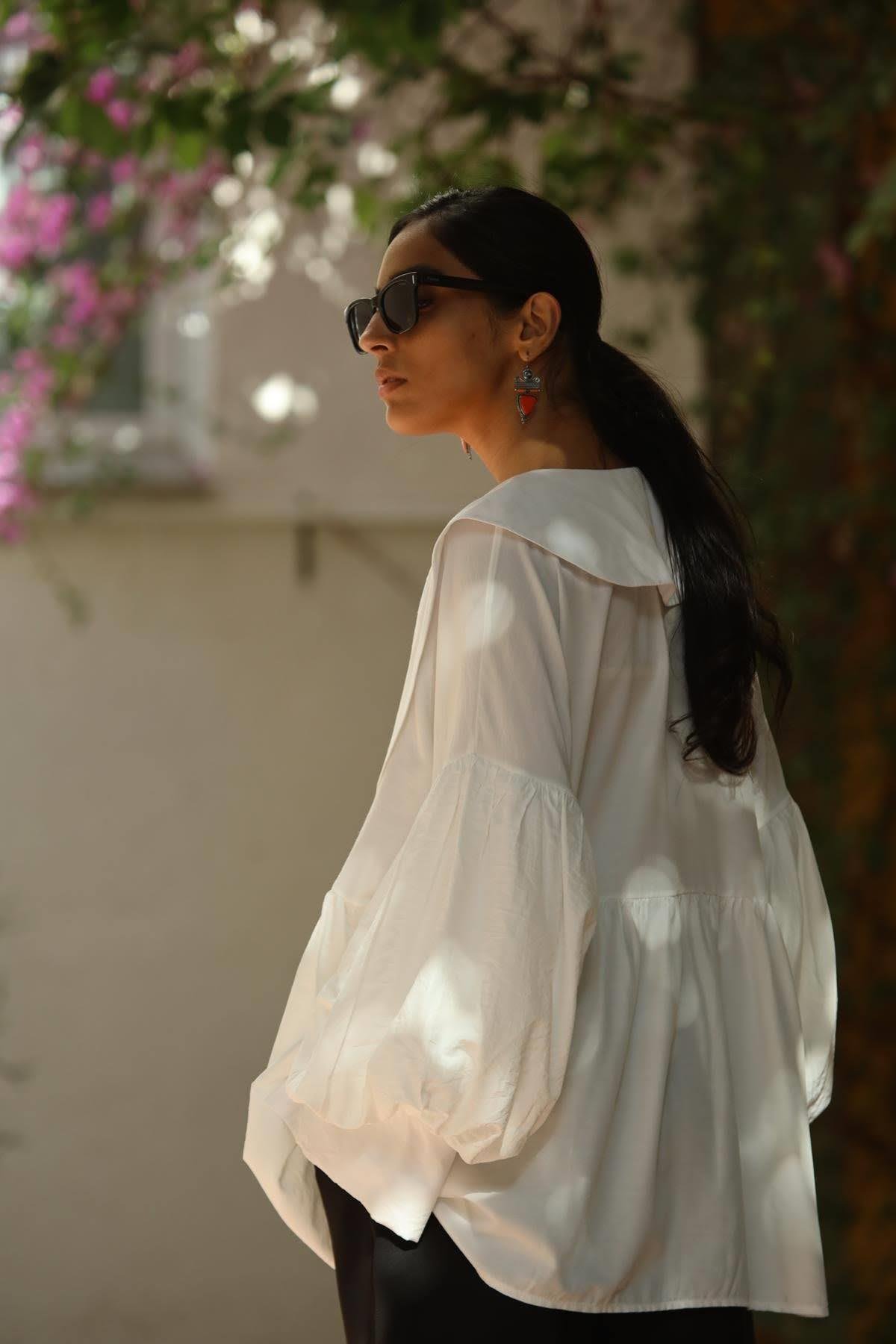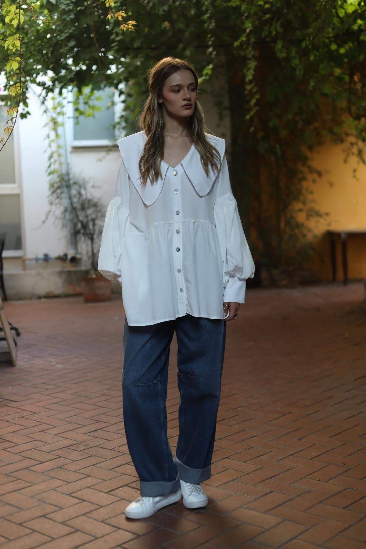 White Large Collar Balloon Sleeve Shirt