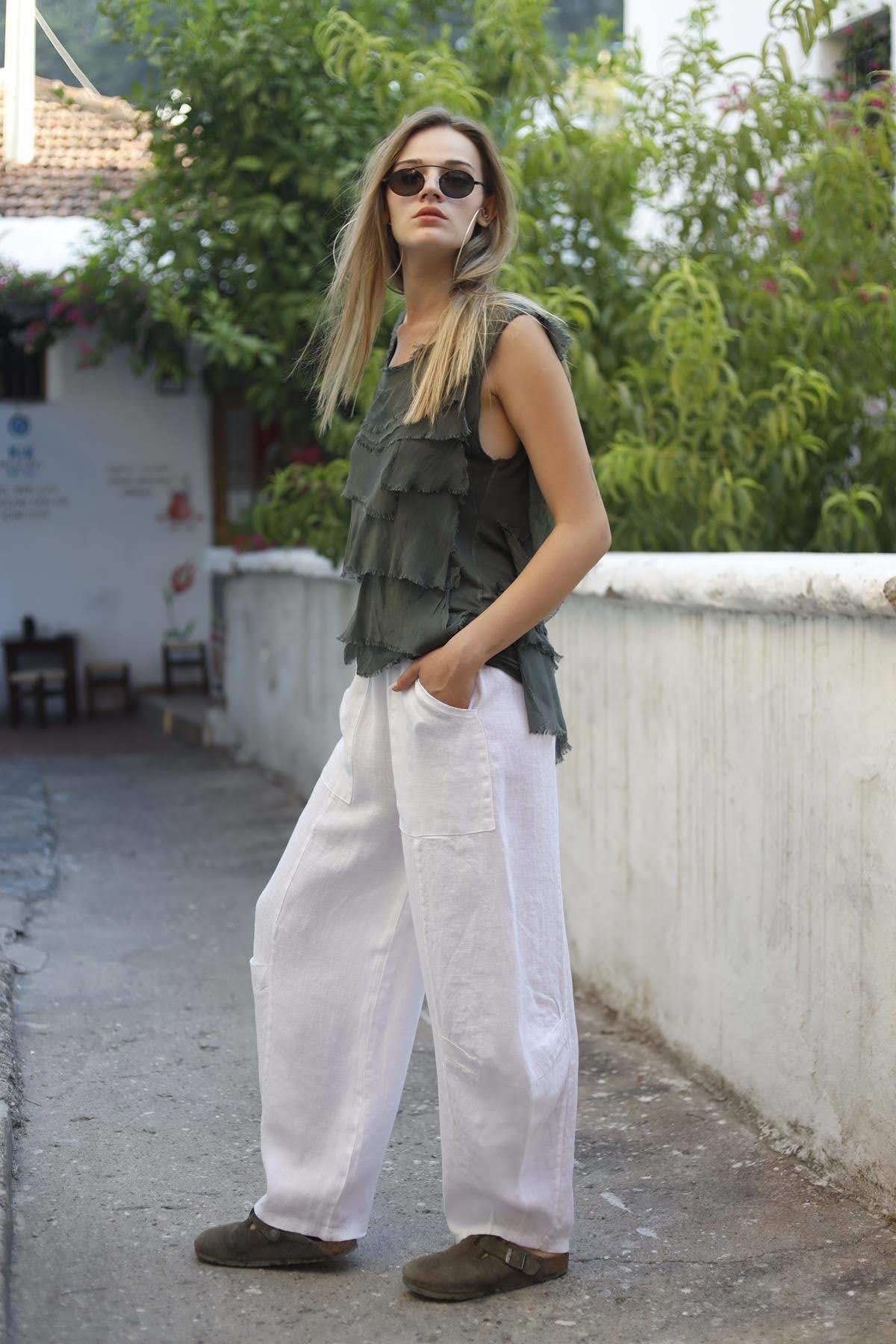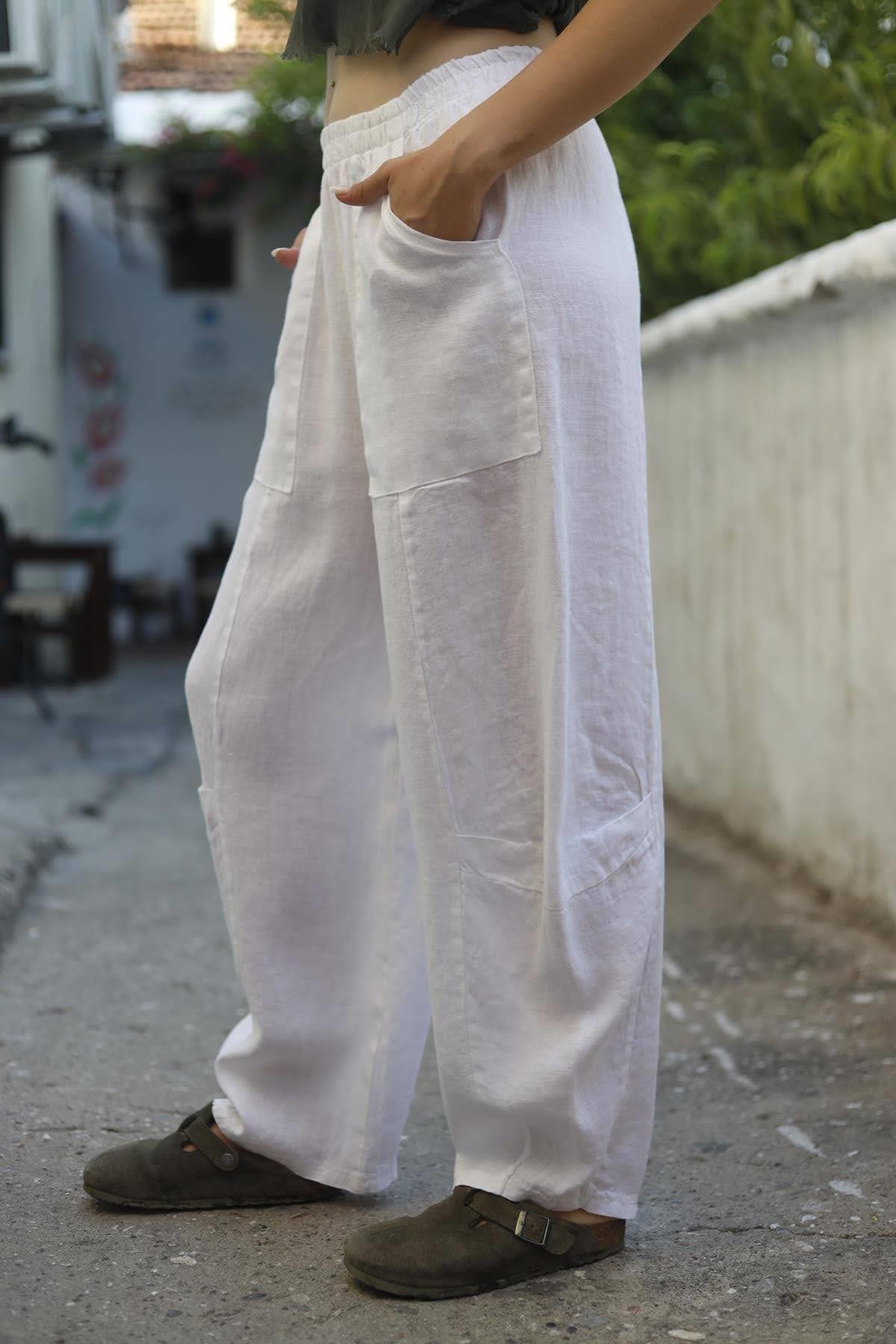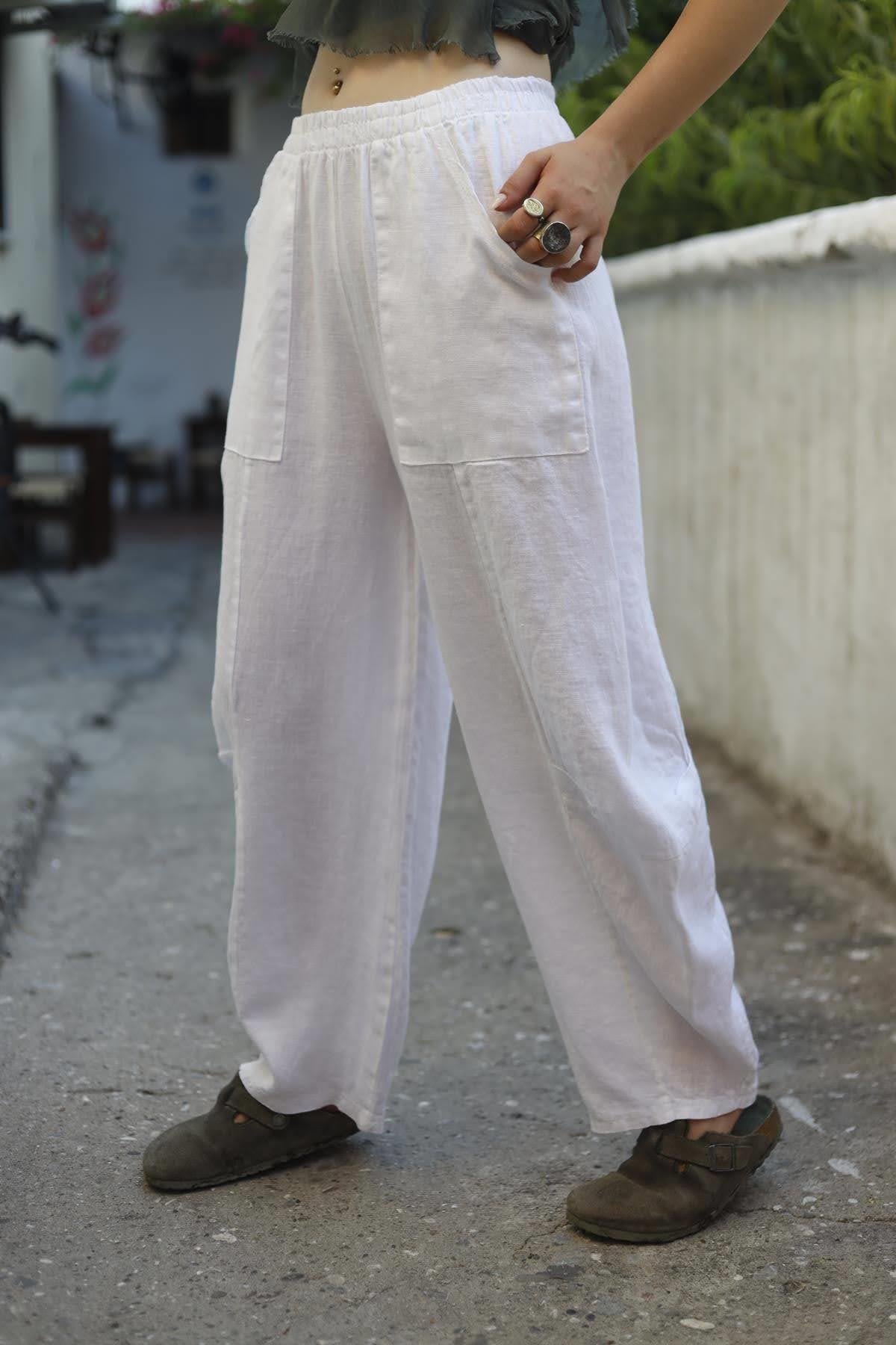 White Stitch Detail Linen Pants