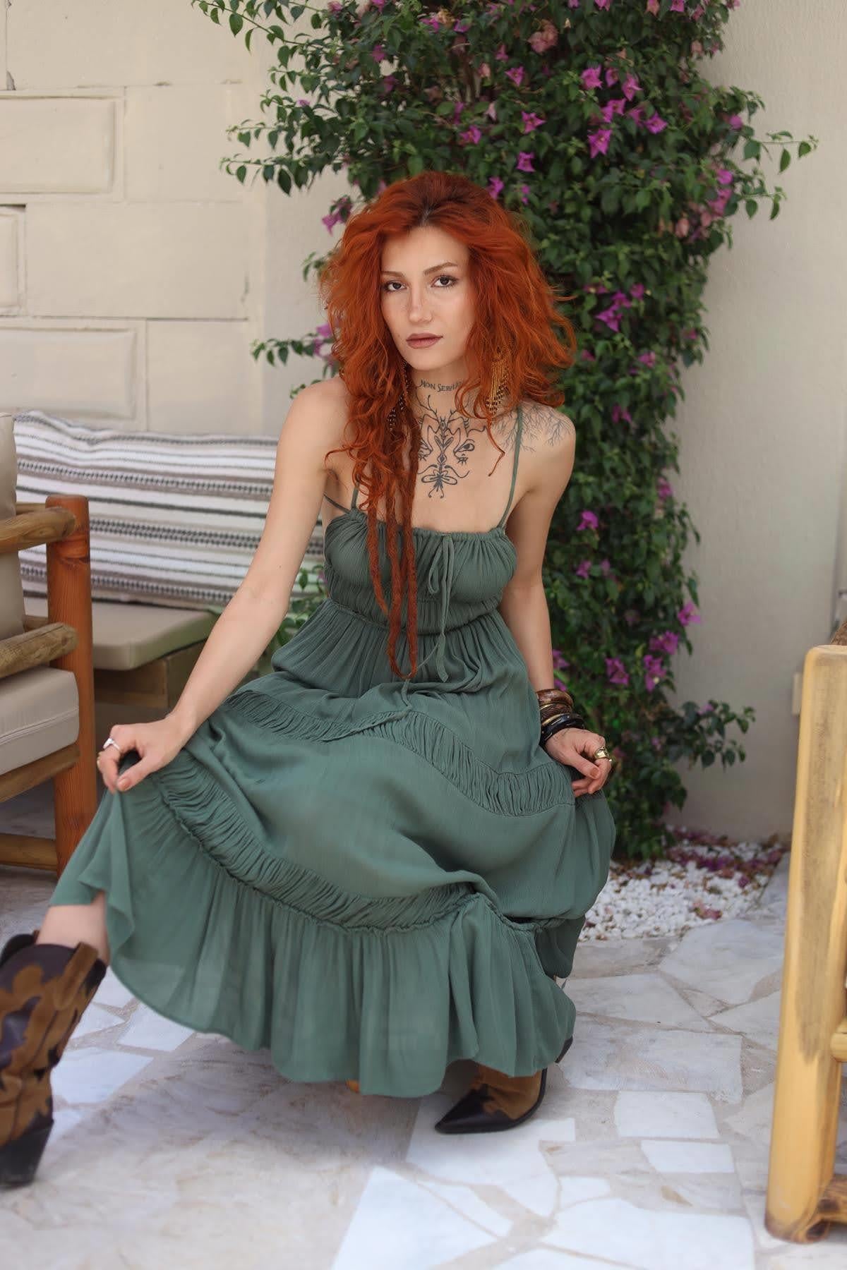 Yeşil Askılı Sırt Dekolteli Bohem Elbise