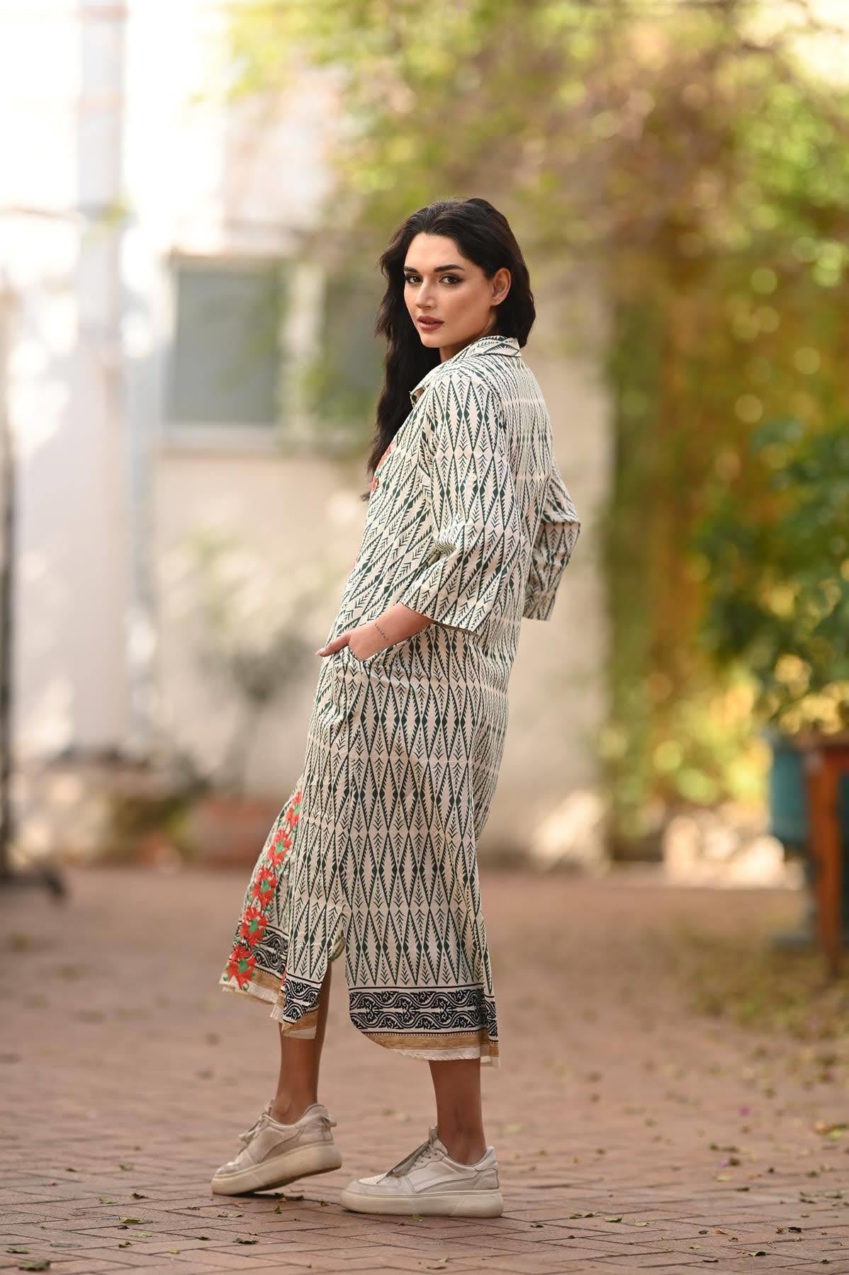 Yeşil Desenli Nakışlı Gömlek Elbise