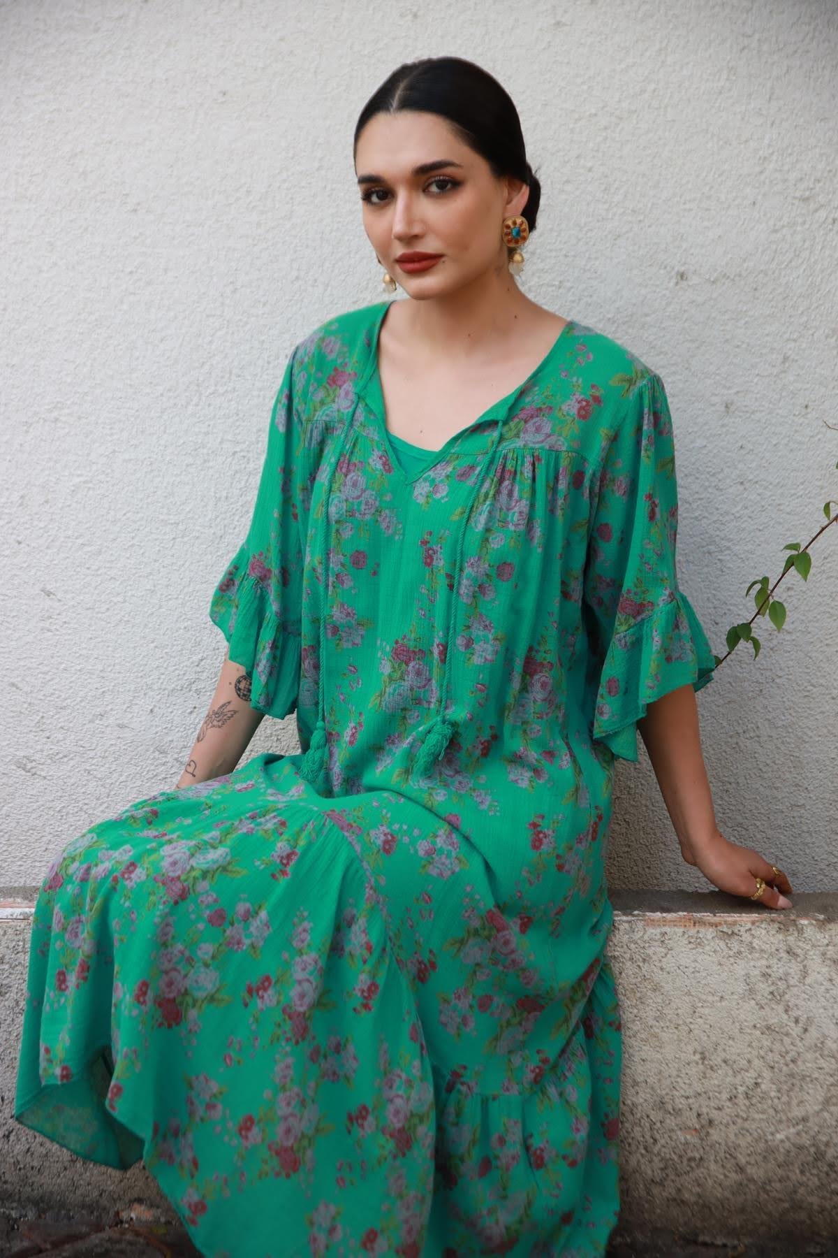 Yeşil Yakası Püsküllü Kolları Volanlı Çiçek Desenli Elbise