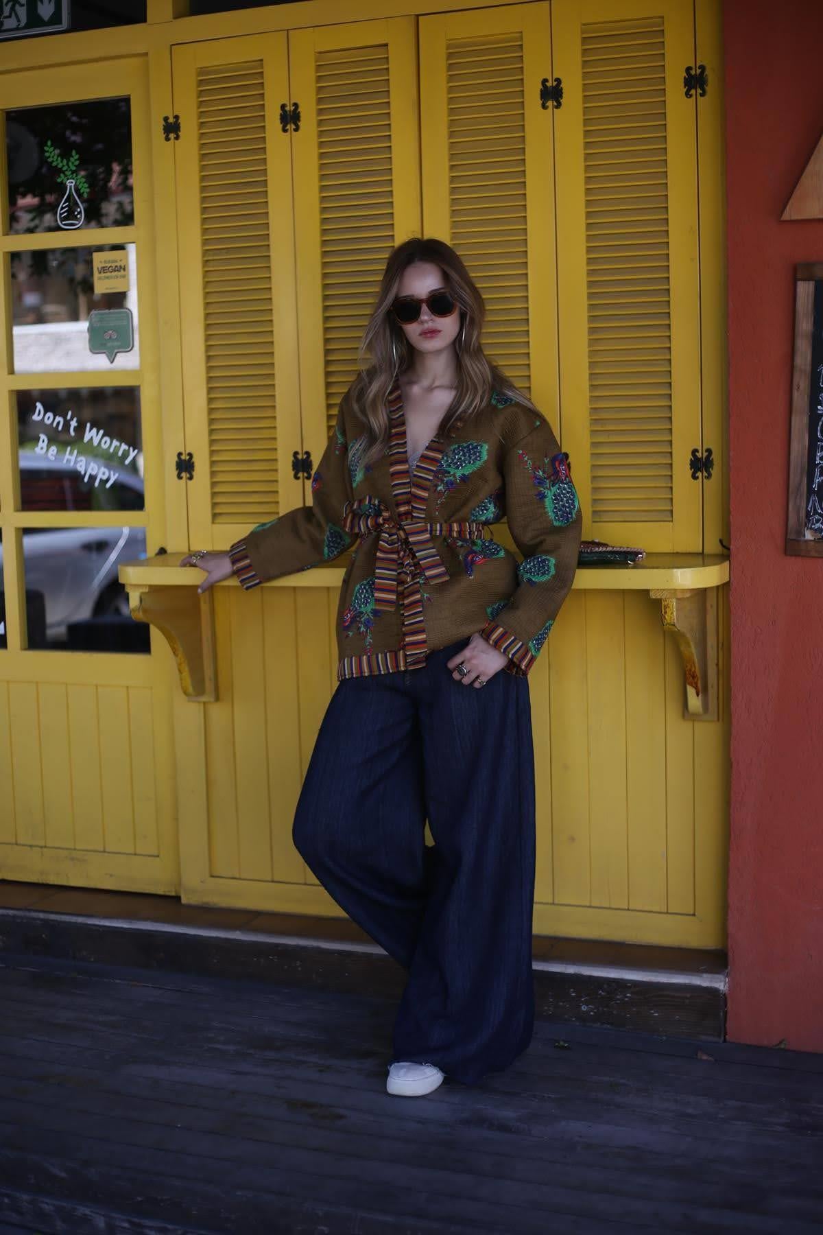 Zeytin Yeşili Desenli Garnili Kapitone Ceket