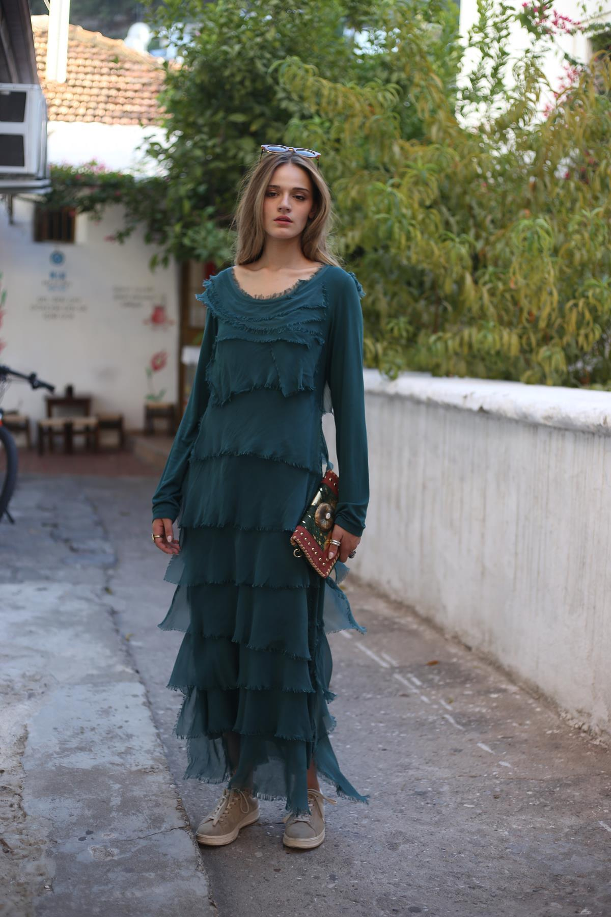 Zümrüt Yeşili İpek Kat Kat Uzun Elbise